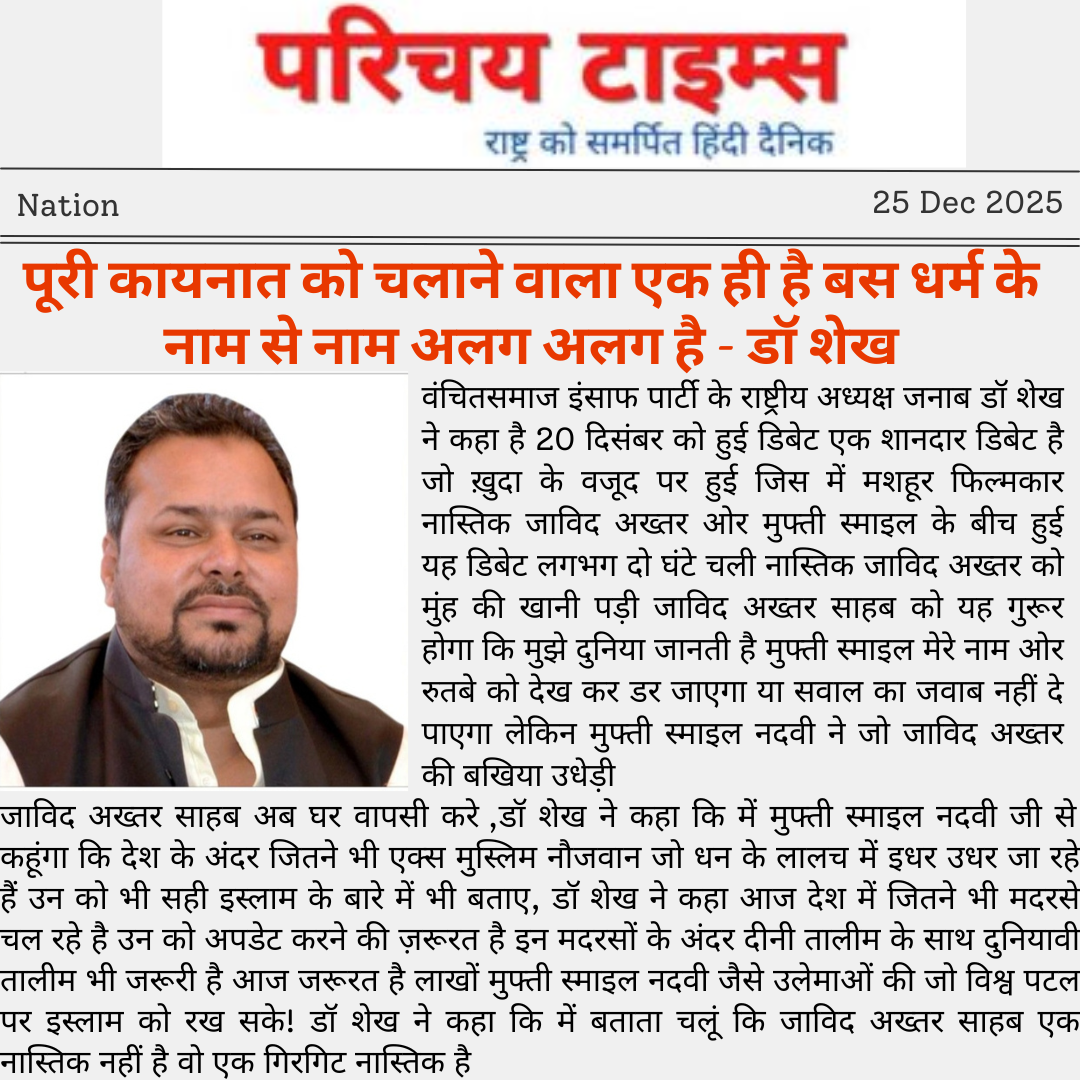 वंचितसमाज इंसाफ पार्टी के राष्ट्रीय अध्यक्ष जनाब डॉ शेख ने कहा है 20 दिसंबर को हुई डिबेट एक शानदार डिबेट है जो ख़ुदा के वजूद पर हुई जिस में मशहूर…