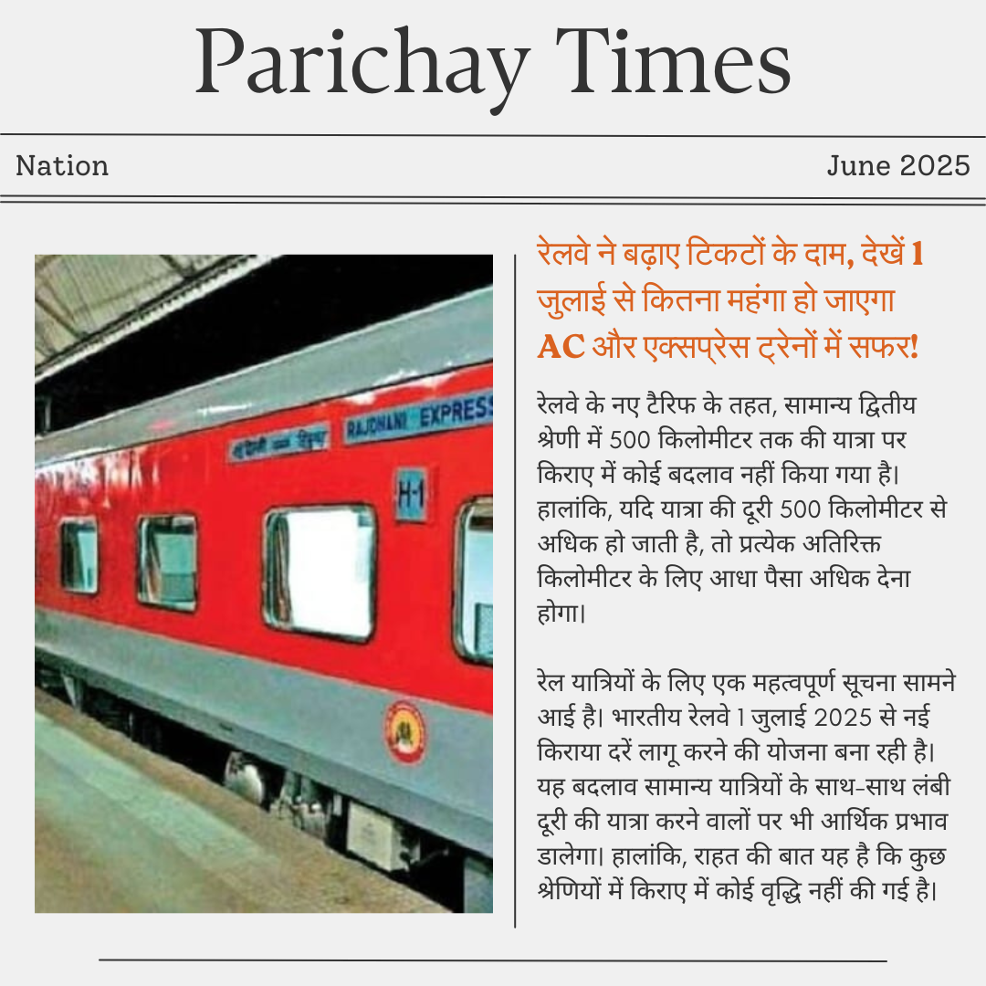 रेल यात्रियों के लिए एक महत्वपूर्ण सूचना सामने आई है। भारतीय रेलवे 1 जुलाई 2025 से नई किराया दरें लागू करने की योजना बना रही है। यह बदलाव सामान्य यात्रियों के साथ-साथ लंबी दूरी की यात्रा करने वालों पर भी आर्थिक प्रभाव डालेगा। हालांकि, राहत की बात यह है कि कुछ श्रेणियों में किराए में कोई वृद्धि नहीं की गई है।