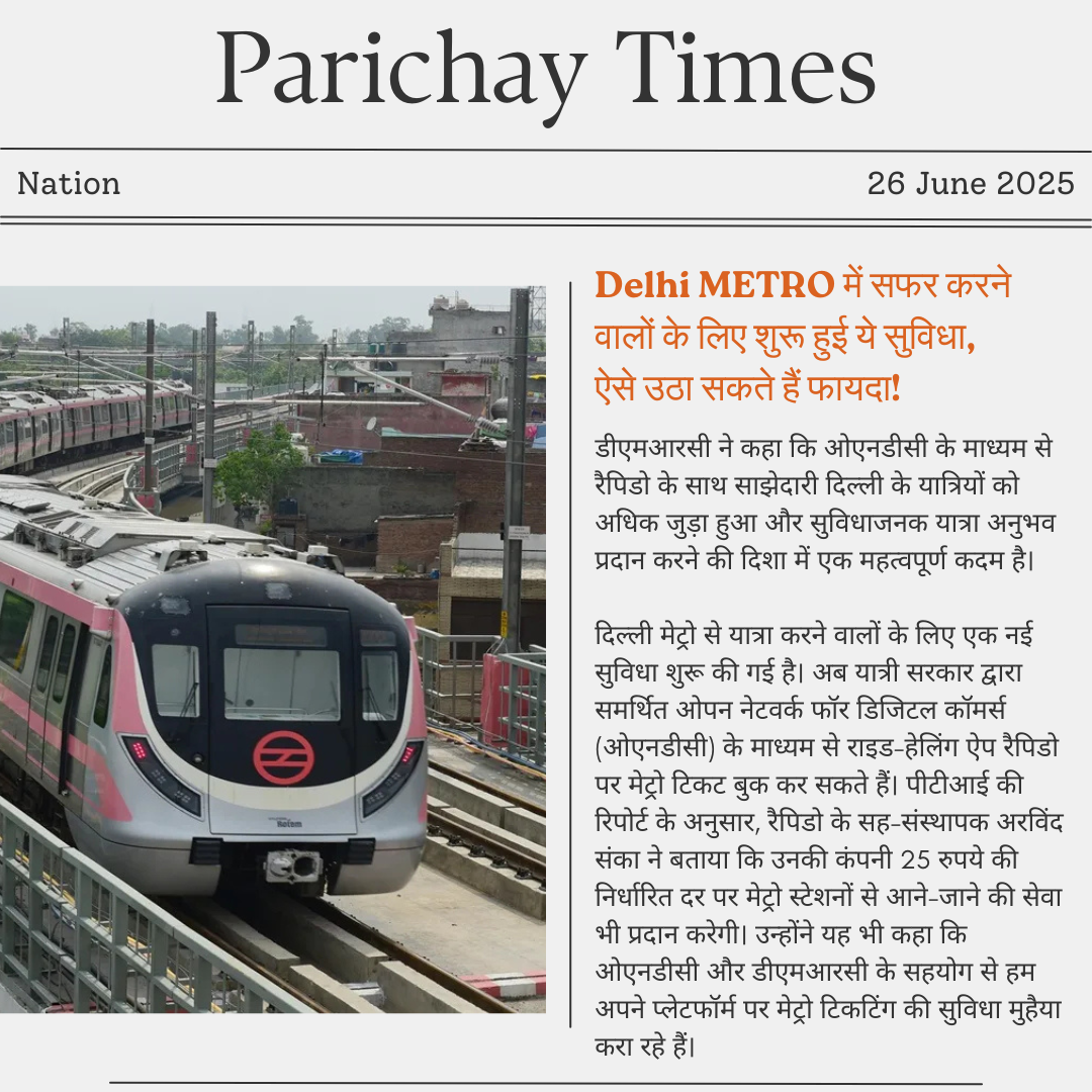 दिल्ली मेट्रो से यात्रा करने वालों के लिए एक नई सुविधा शुरू की गई है। अब यात्री सरकार द्वारा समर्थित ओपन नेटवर्क फॉर डिजिटल कॉमर्स (ओएनडीसी) के माध्यम से राइड-हेलिंग ऐप रैपिडो पर मेट्रो टिकट बुक कर सकते हैं। पीटीआई की रिपोर्ट के अनुसार, रैपिडो के सह-संस्थापक अरविंद संका ने बताया कि उनकी कंपनी 25 रुपये की निर्धारित दर पर मेट्रो स्टेशनों से आने-जाने की सेवा भी प्रदान करेगी। उन्होंने यह भी कहा कि ओएनडीसी और डीएमआरसी के सहयोग से हम अपने प्लेटफॉर्म पर मेट्रो टिकटिंग की सुविधा मुहैया करा रहे हैं।