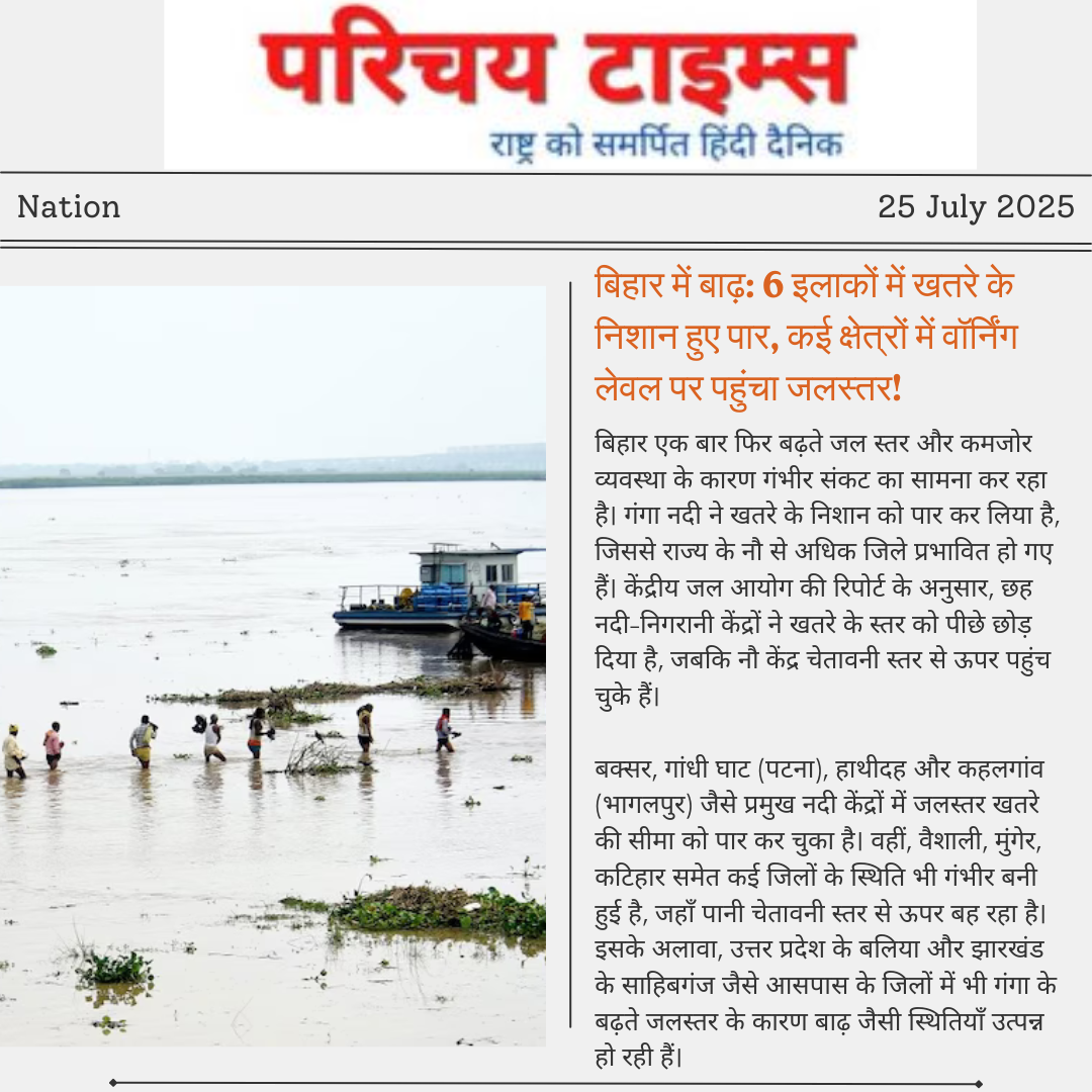 बिहार एक बार फिर बढ़ते जल स्तर और कमजोर व्यवस्था के कारण गंभीर संकट का सामना कर रहा है। गंगा नदी ने खतरे के निशान को पार कर लिया है, जिससे राज्य के नौ से अधिक जिले प्रभावित हो गए हैं। केंद्रीय जल आयोग की रिपोर्ट के अनुसार, छह नदी-निगरानी केंद्रों ने खतरे के स्तर को पीछे छोड़ दिया है, जबकि नौ केंद्र चेतावनी स्तर से ऊपर पहुंच चुके हैं।