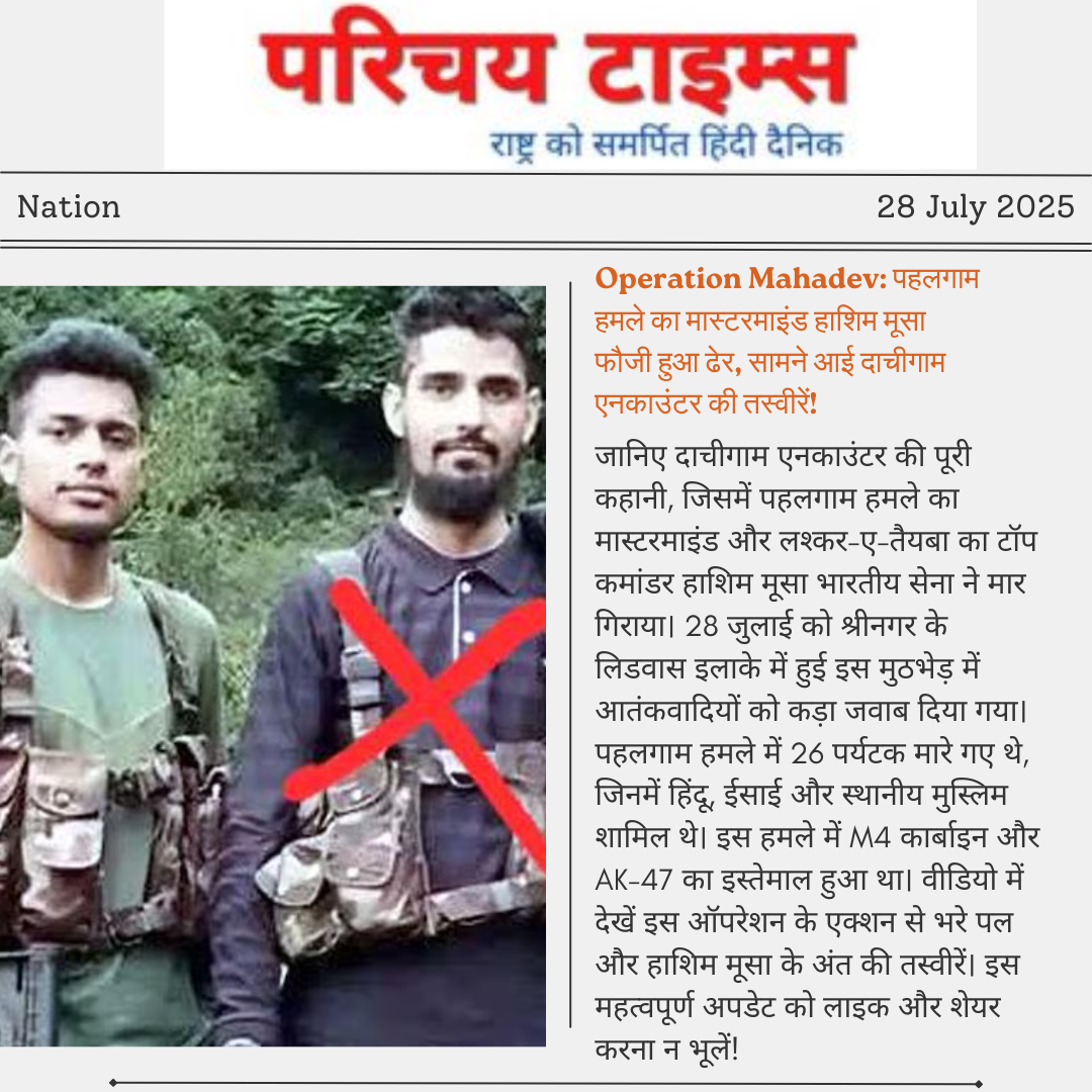 जम्मू-कश्मीर के पहलगाम हमले के मुख्य साजिशकर्ता और लश्कर-ए-तैयबा (LeT) के टॉप कमांडर हाशिम मूसा, जो पहले पाकिस्तानी सेना का सैनिक रह चुका था, को भारतीय सेना ने आखिरकार ढेर कर दिया है। यह मुठभेड़ 28 जुलाई को श्रीनगर के लिडवास इलाके में हुई। अब इस एनकाउंटर से जुड़ी तस्वीरें भी सामने आ चुकी हैं।