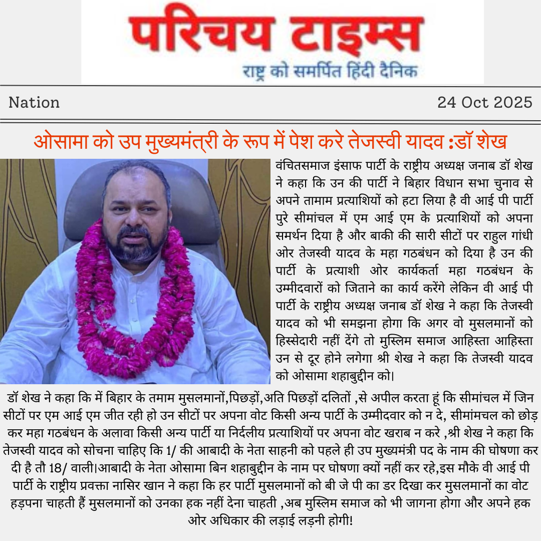 वंचितसमाज इंसाफ पार्टी के राष्ट्रीय अध्यक्ष जनाब डॉ शेख ने कहा कि उन की पार्टी ने बिहार विधान सभा चुनाव से अपने तामाम प्रत्याशियों को हटा लिया है वी आई पी पार्टी पुरे सीमांचल में एम आई एम के प्रत्याशियों को अपना समर्थन दिया है और बाकी की सारी सीटों पर राहुल गांधी ओर तेजस्वी यादव के महा गठबंधन को दिया है उन की पार्टी के प्रत्याशी ओर कार्यकर्ता महा गठबंधन के उम्मीदवारों को जिताने का कार्य करेंगे लेकिन वी आई पी पार्टी के राष्ट्रीय अध्यक्ष जनाब डॉ शेख ने कहा कि तेजस्वी यादव को भी समझना होगा कि अगर वो मुसलमानों को हिस्सेदारी नहीं देंगे तो मुस्लिम समाज आहिस्ता आहिस्ता उन से दूर होने लगेगा श्री शेख ने कहा कि तेजस्वी यादव को ओसामा शहाबुद्दीन को।वोटिंग से पहले अप मुख्यमंत्री बनाने का वादा मुस्लिम समाज से करे साथ में ओसामा को अपनी बड़ी बड़ी रैलियों में पूरे बिहार में पेश करे इस से मुस्लिम समाज एकतरफा आर जे डी की तरफ जुड़ेगा ओर वोट में तब्दील होगा क्योंकि मरहूम।शहाबुद्दीन एक ऐसा नाम है जो बिहार ही नहीं पूरे हिंदुस्तान में भली भांति जाना जाता है,