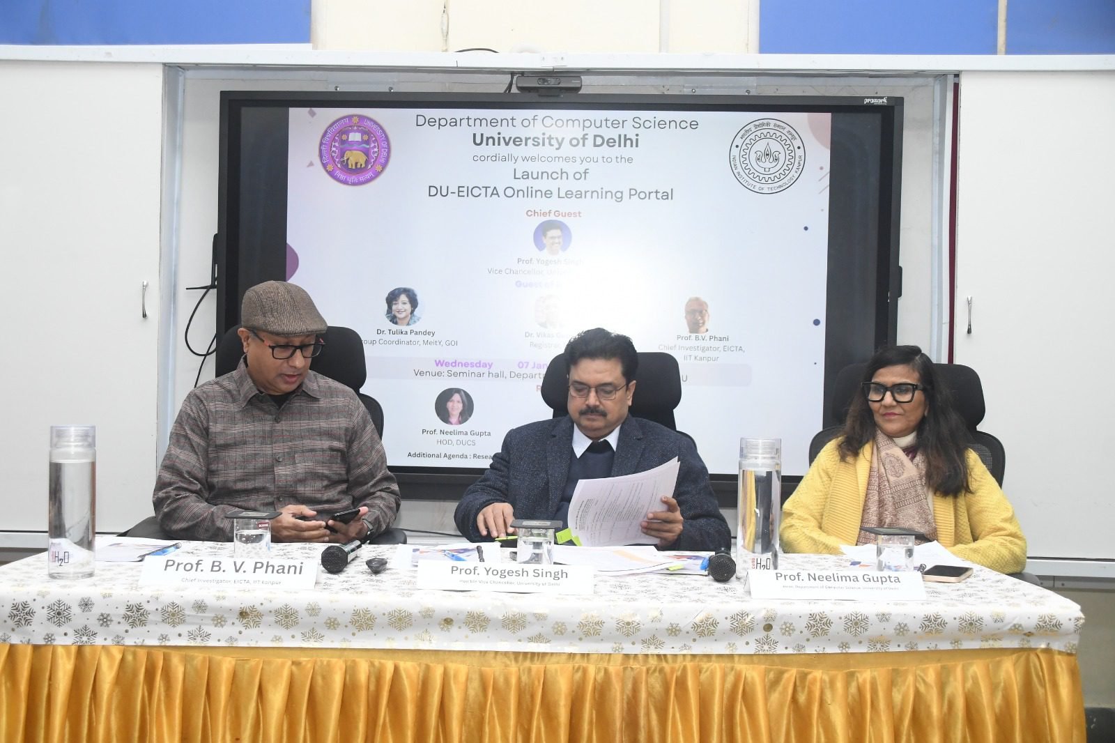 तेजी से बदलती टेक्नोलॉजी के दौर में सिर्फ काबिलियत काफी नहीं है: प्रो. योगेश सिंह, दिल्ली विश्वविद्यालय और इलेक्ट्रॉनिक्स एंड आईसीटी एकेडमी (EICTA) के बीच पहले हुए समझौता ज्ञापन (MoU) के अनुसार, एक खास DU–EICTA लर्निंग पोर्टल (https://www.eicta.iitk.ac.in/du) को दिल्ली विश्वविद्यालय के कुलपति प्रो. योगेश सिंह ने इलेक्ट्रॉनिक्स एंड आईसीटी एकेडमी (EICTA), आईआईटी कानपुर के गेस्ट ऑफ ऑनर और चीफ इन्वेस्टिगेटर प्रोफेसर बी वी फानी; कंप्यूटर साइंस डिपार्टमेंट की हेड प्रोफेसर नीलिमा गुप्ता; इलेक्ट्रॉनिक्स और सूचना प्रौद्योगिकी मंत्रालय, भारत सरकार के अतिरिक्त निदेशक सुरेंद्र सिंह; प्रोजेक्ट एग्जीक्यूटिव ऑफिसर डॉ. श्रीनिवास; दिल्ली विश्वविद्यालय के कंप्यूटर साइंस डिपार्टमेंट के एसोसिएट प्रोफेसर डॉ. ओम पाल, अन्य सहयोगियों और छात्रों की मौजूदगी में आधिकारिक तौर पर लॉन्च किया।