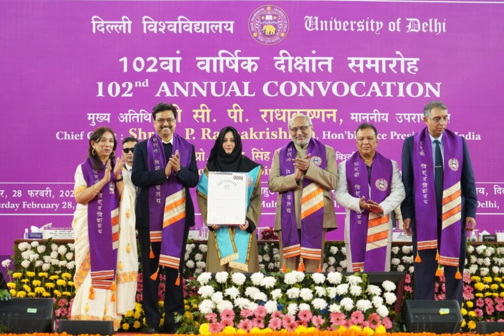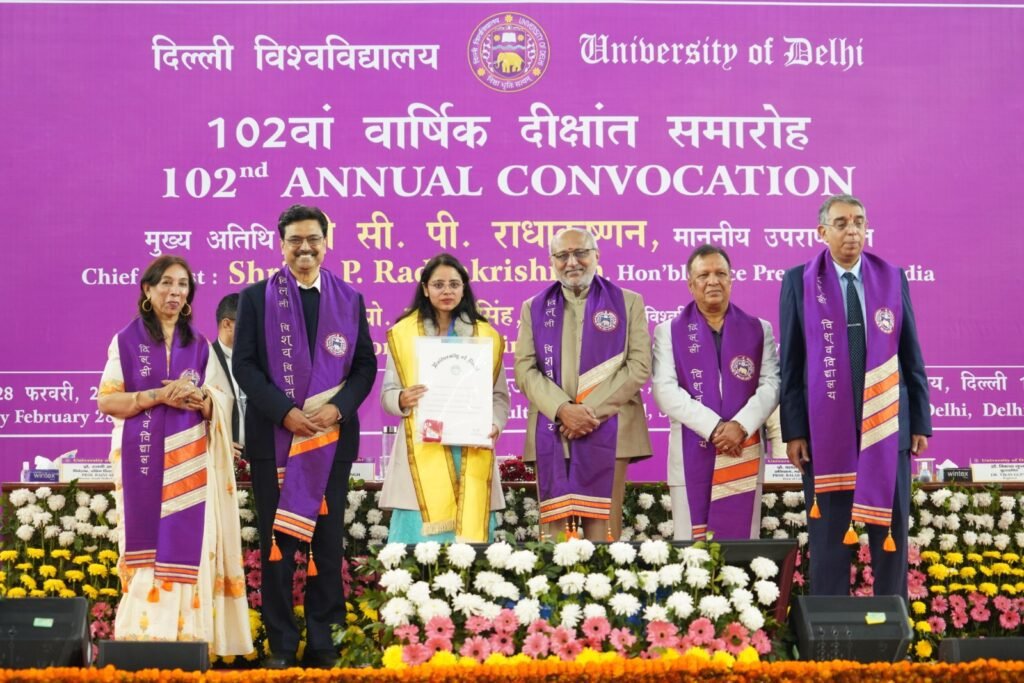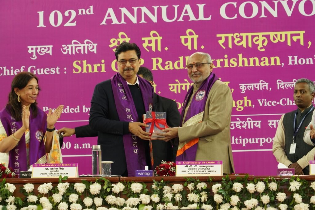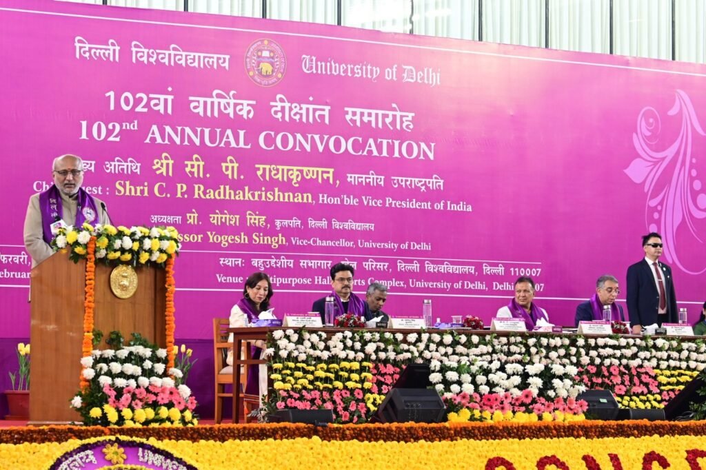 भारत के माननीय उपराष्ट्रपति एवं दिल्ली विश्वविद्यालय के कुलाधिपति श्री सी.पी. राधाकृष्णन ने कहा कि महान विश्वविद्यालय सिर्फ़ इंफ्रास्ट्रक्चर से नहीं, बल्कि चरित्र निर्माण और विद्यार्थियों में डाले जाने वाले मूल्यों से पहचाने जाते हैं। उपराष्ट्रपति दिल्ली विश्वविद्यालय के 102 वें दीक्षांत समारोह में बतौर मुख्य अतिथि संबोधित कर रहे थे। इस अवसर पर उन्होंने बटन दबा कर 120408 विद्यार्थियों की डिजिटल डिग्रियाँ भी जारी की। इसके साथ ही मुख्य अतिथि ने 10 प्रतिभाशाली विद्यार्थियों को अपने हाथों से मेडल भी प्रदान किए। इस अवसर पर बुक ऑफ हाइलाइट्स नामक पुस्तक भी जारी की गई। विश्वविद्यालय के बहुउद्देशीय खेल परिसर में आयोजित इस दीक्षांत समारोह की अध्यक्षता करते हुए दिल्ली विश्वविद्यालय के कुलपति प्रो. योगेश सिंह ने की। कुलपति ने विद्यार्थियों को संबोधित करते हुए कहा कि यह देश हमारा है और इसकी चिंता भी हमें ही करनी होगी।