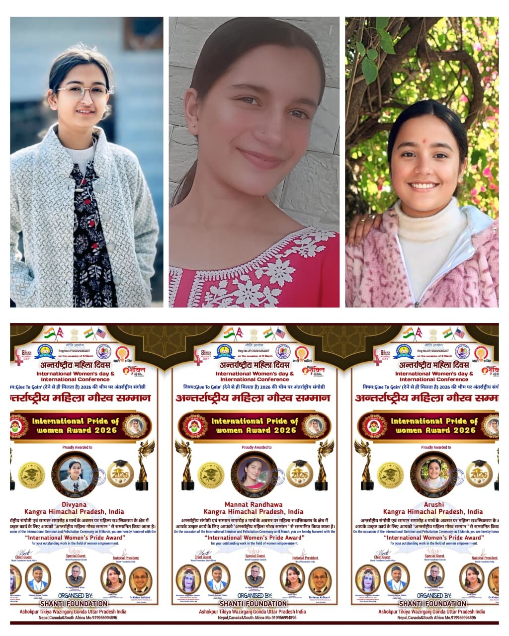 अंतर्राष्ट्रीय महिला दिवस के शुभ अवसर पर शांति फाउंडेशन गोंडा उत्तर प्रदेश द्वारा साहित्य के क्षेत्र में लगातार किए जाने वाले प्रयासों और उनके उत्कृष्ट कार्य के लिए गाहलियां विद्यालय की छात्राएं मन्नत रंधावा,आरुषि और दिव्याना को इंटरनेशनल प्राइड ऑफ़ वीमेन अवार्ड 2026 से सम्मानित किया गया।
